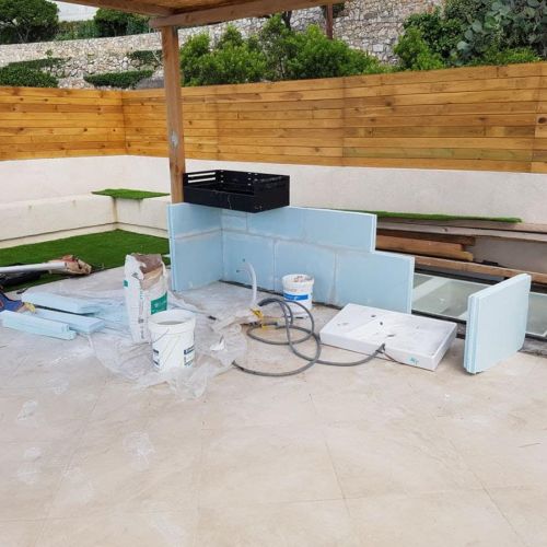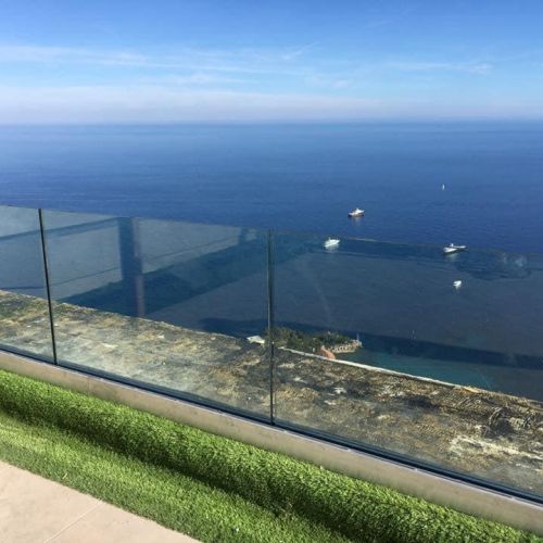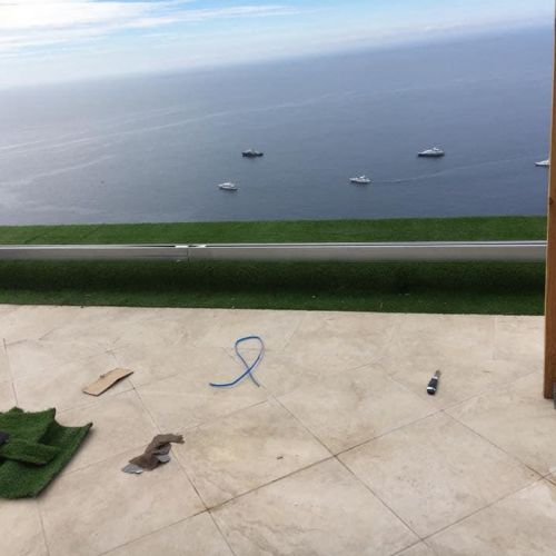 Терасса с видом на море. 🌊 В качестве декоративного ограждения для террасы были использованы, с одной стороны стекло, которое помогает защититься от ветра, и одновременно не ограничивать обзор, с другой стороны, дерево. Для полового покрытия были выбраны плитка и декоративный газон. В качестве навеса были использованы натуральные материалы. Также была обустроена удобная барбекю-зона.