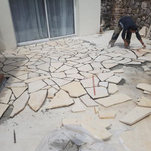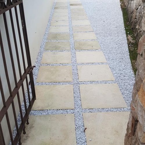 Был использован натуральный камень и насыпка из гравия, что придало некую изюминку дворику. Натуральный камень выполняет не только коммуникативные функции, связывая дом с беседками и террасами, но и служит украшением участка, поддерживая стилистику стен и лестниц.