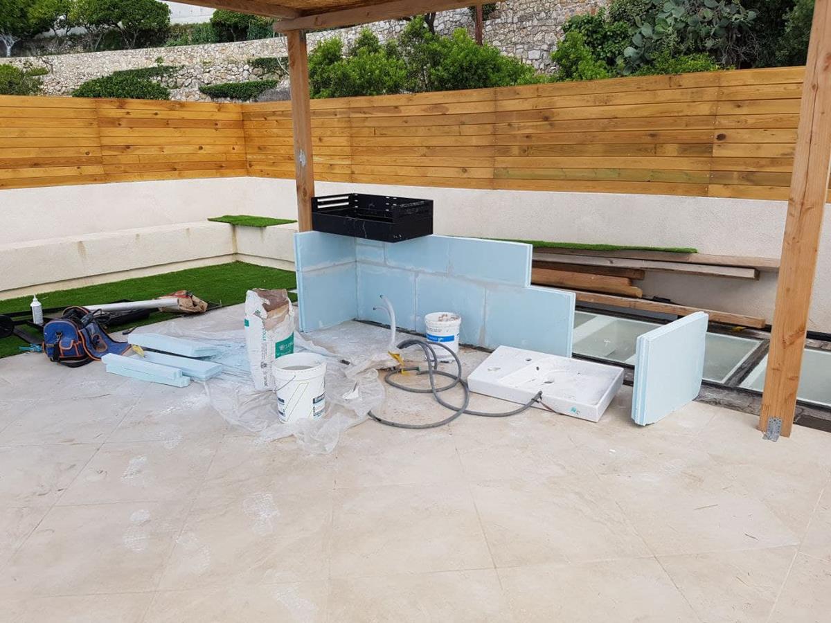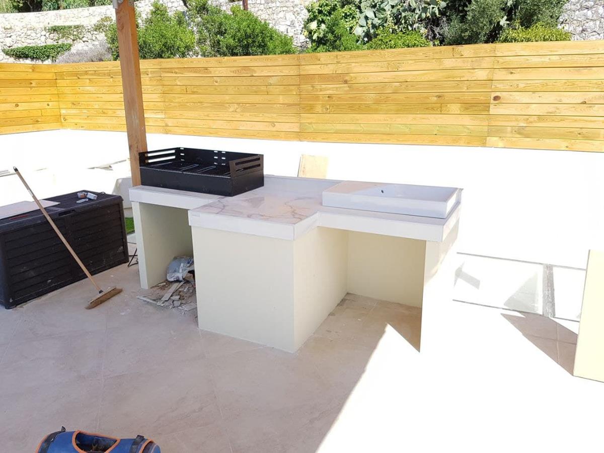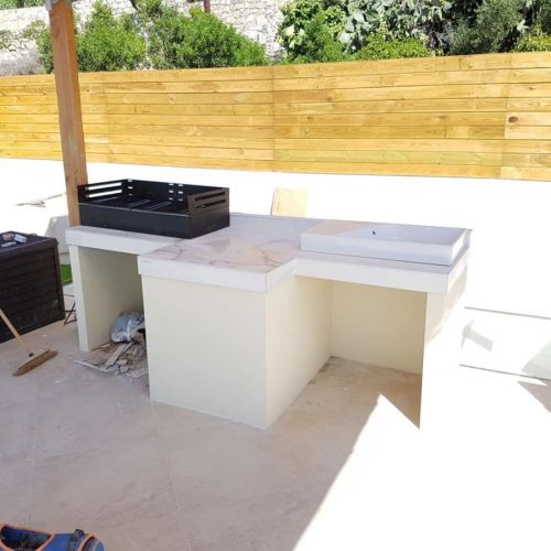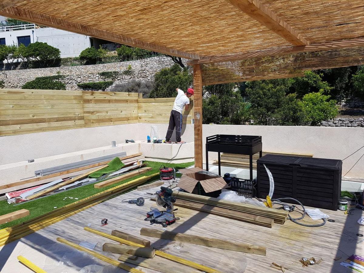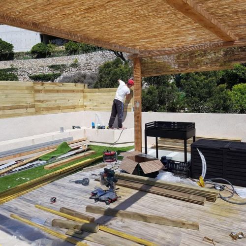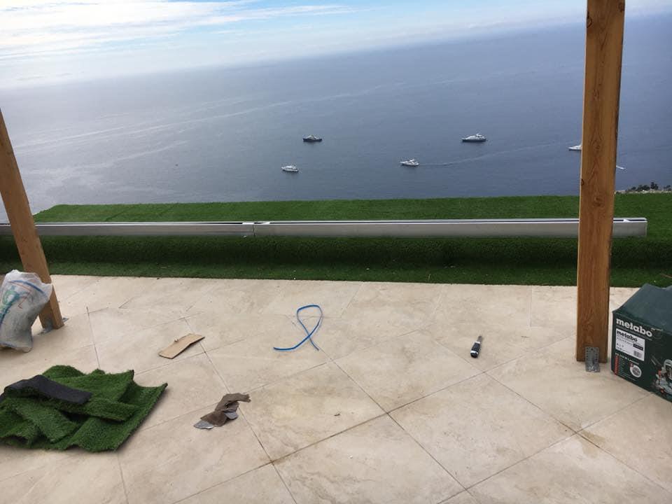 Терасса с видом на море. 🌊 В качестве декоративного ограждения для террасы были использованы, с одной стороны стекло, которое помогает защититься от ветра, и одновременно не ограничивать обзор, с другой стороны, дерево. Для полового покрытия были выбраны плитка и декоративный газон. В качестве навеса были использованы натуральные материалы. Также была обустроена удобная барбекю-зона.