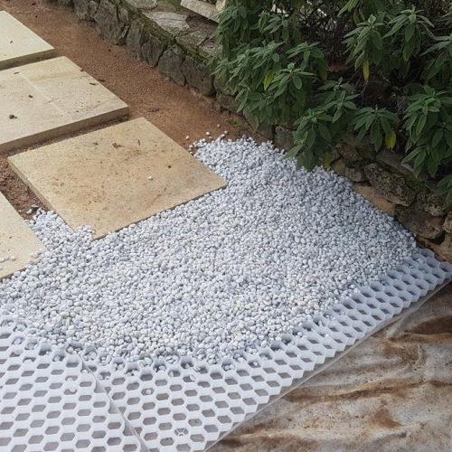Был использован натуральный камень и насыпка из гравия, что придало некую изюминку дворику. Натуральный камень выполняет не только коммуникативные функции, связывая дом с беседками и террасами, но и служит украшением участка, поддерживая стилистику стен и лестниц.